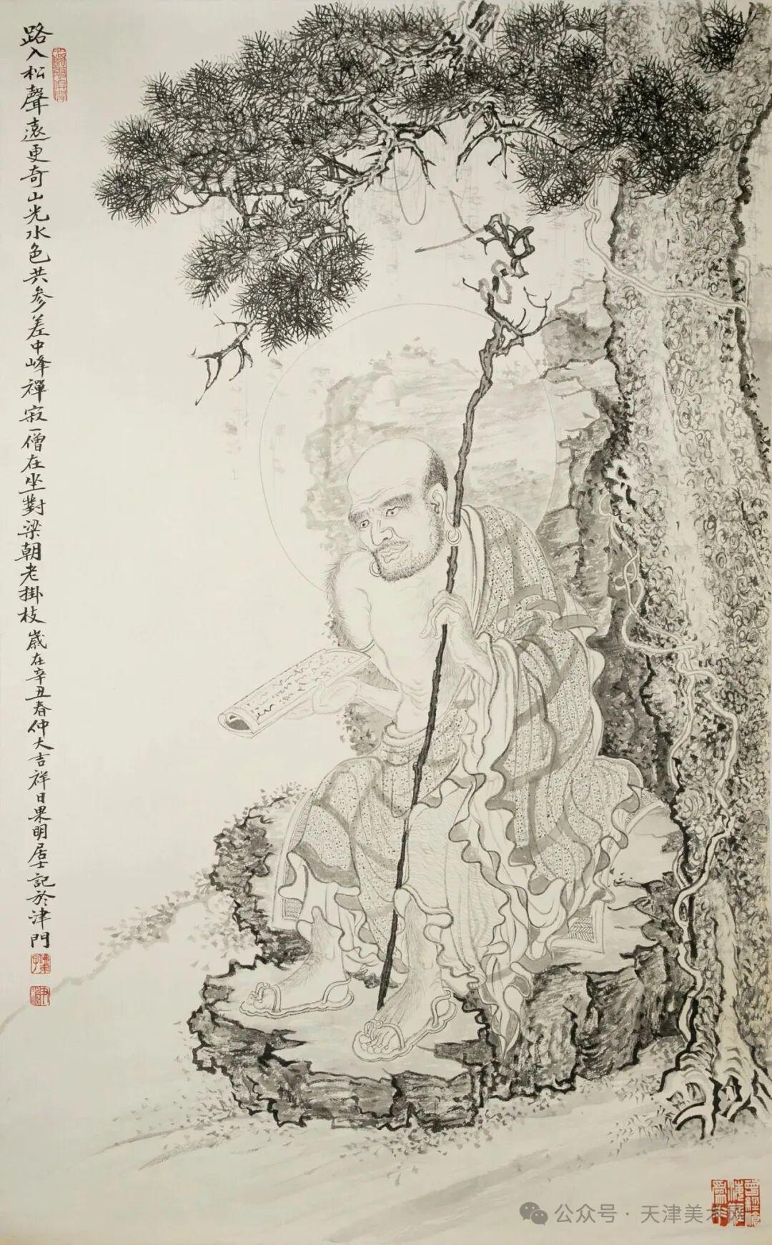 他的人物画,上追唐宋元明先贤的高古之意,下效张大千摹写敦煌重彩的执着;山水画则以明末清初四僧、黄山画派为宗,融入教学心得与当下体悟;偶作大写意花鸟,点缀其间,丰富意趣。