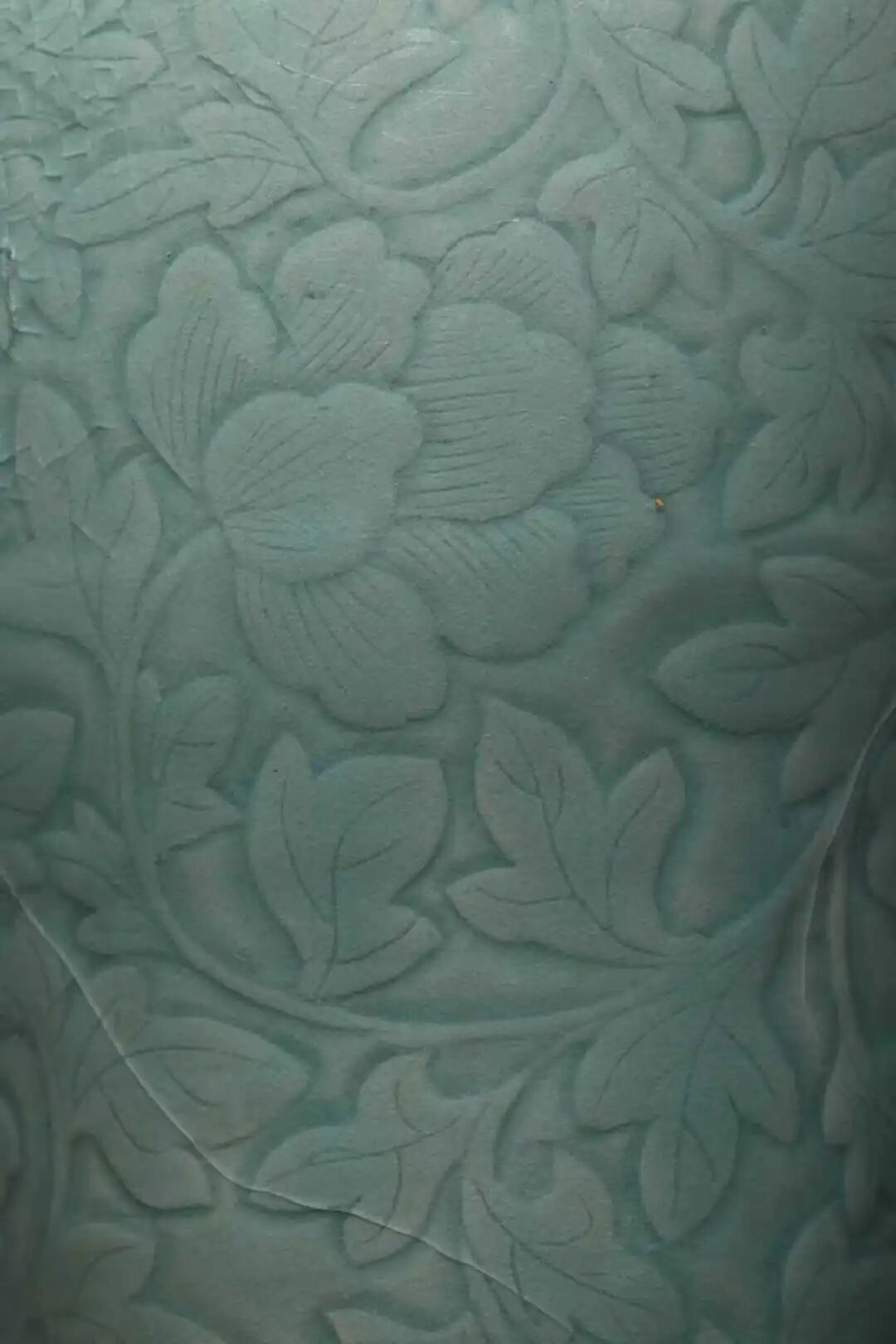 高丽青瓷素有翡色之称,此梅瓶唇口圆润,圆肩高挺,长圆腹自肩至底渐敛,圈足隐约,整体造型修长优雅,线条流畅自然,静中寓动。通体施青釉,色泽高丽翡绿,釉水澄澈清润,光泽内敛温润,如凝而未凝,含蓄清雅。瓶身满刻缠枝牡丹,枝叶舒展卷曲,茎脉纤细入微,繁密而不杂,生动自然。釉面似古潭静水,澄明安宁,潭心隐见微微石色,灰青透出水底卵石之韵,神采内敛含蓄。整体釉色清润匀净,于淡青之间微泛灰绿,层次递进,既彰工艺精巧,又显雅致清幽之美。