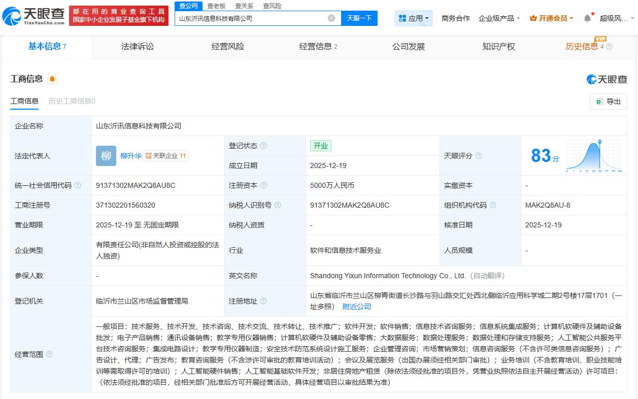 天眼查工商信息显示,近日,山东沂讯信息科技有限公司成立,法定代表人为柳升华,注册资本5000万人民币,经营范围包括人工智能公共服务平台技术咨询服务、集成电路设计、人工智能基础软件开发等。股东信息显示,该公司由科大讯飞(002230)全资持股。