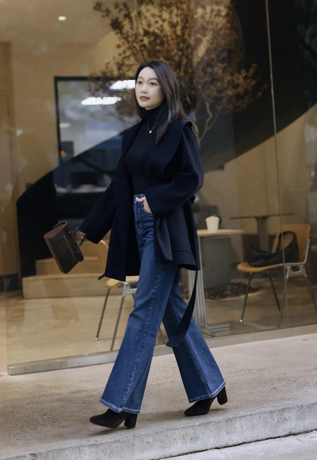 具体怎么穿?分两种情况:如果穿的是宽松版型的黑色大衣,内搭就要选修身一点的。