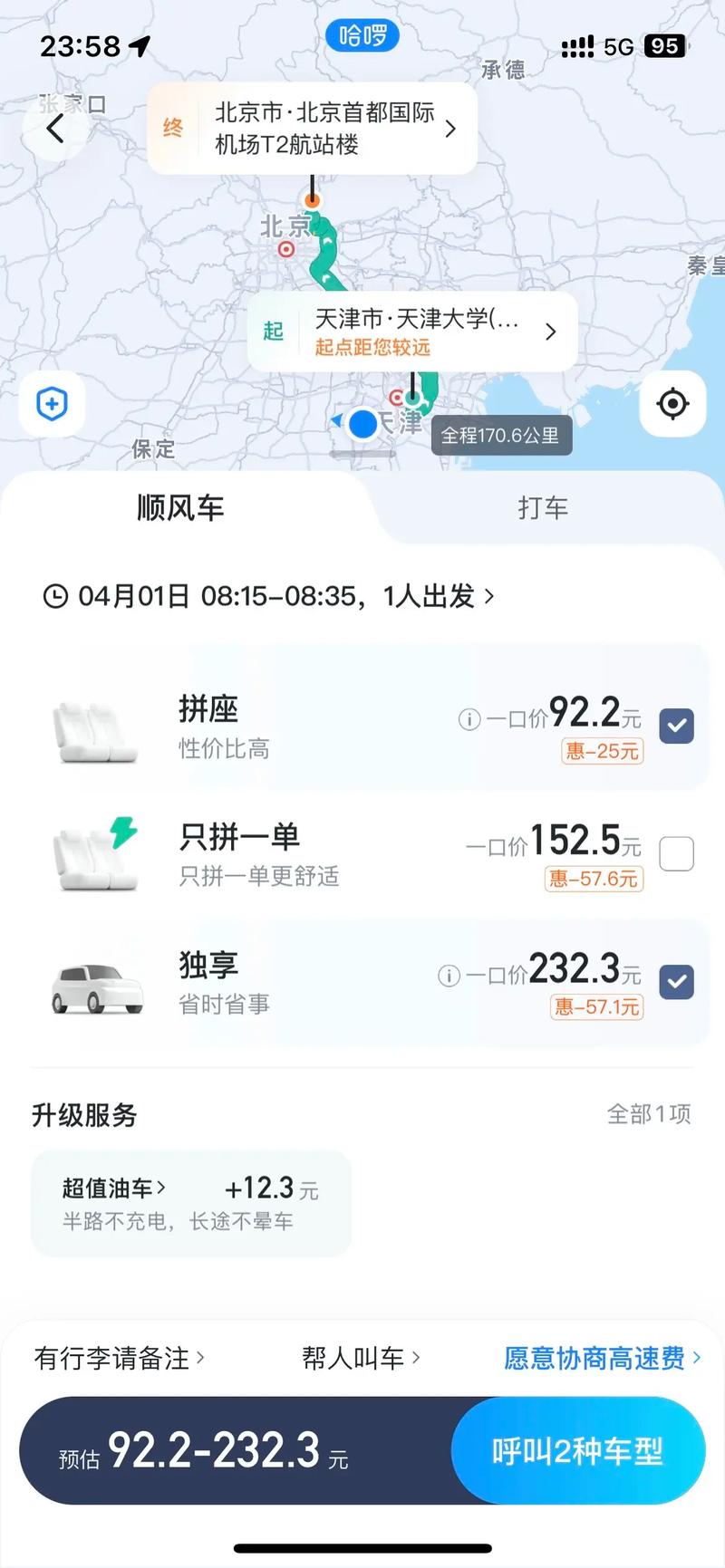 打开顺风车App,选择目的地,点击下单,系统会显示“顺路度95%”、“顺路度80%”等标签。