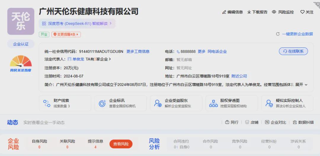 2024年跑到了广州,先开了一个叫广州天伦乐健康有限公司的公司,从湖南招聘了一些人员,还在湖南大学发布了招聘广告,结果半年发不发工资,有人后来才发现,纯粹的骗子行为。