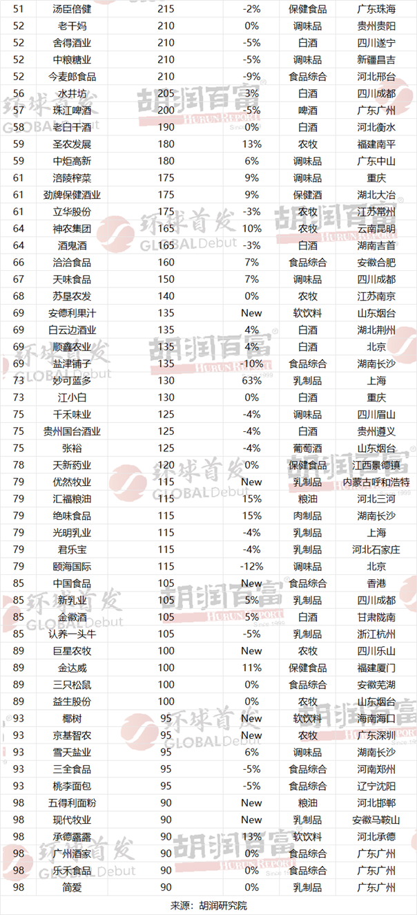 胡润集团董事长兼首席调研官胡润表示:“对比四年前第一份胡润中国食品行业百强榜,一个明显的趋势是健康化。白酒企业上榜数量从高峰时的26家降至今年的22家,肉制品企业从高峰5家降至2家。同时,乳制品企业上榜数量从最低7家升至11家,农牧企业从最低9家升至12家。简单来说,就是消费者减少‘喝酒’与‘吃肉’,关注‘食材’和‘营养’。”