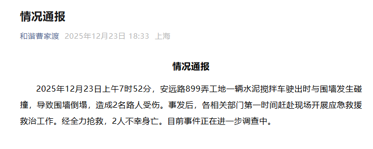 上海静安区通报:水泥搅拌车撞塌围墙,造成2名路人身亡