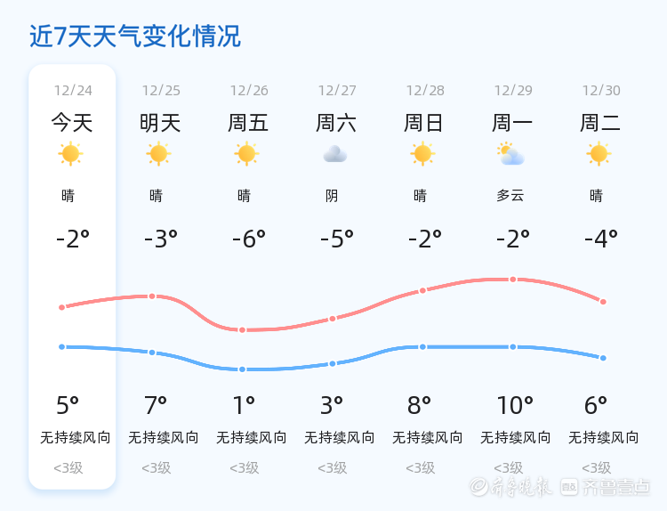 今天是12月24日,星期三,农历十一月初五。潍坊市今日天气晴朗,气温范围在-2℃至5℃之间,西北风1级,空气湿度为90%,PM2.5指数为80。各区天气情况总体平稳,均为晴朗天气,适合市民户外活动。明天天气与今日相比,晴朗依旧,但气温略有上升,预计最低气温为-3℃,最高气温可达7℃,风力稍有增强,西北风3-4级。市民需注意保暖,尤其是早晚出行时,建议增添衣物。未来三天,潍坊市天气将以晴朗为主,气温呈现小幅波动趋势。周五最低气温将降至-6℃,最高气温为1℃,周六天气转阴,气温略有回升,周日再次迎来晴朗天气,最高气温可达8℃。提醒市民根据天气变化及时增减衣物,周五低温可能伴有冰冻,出行请注意防滑。温馨提示