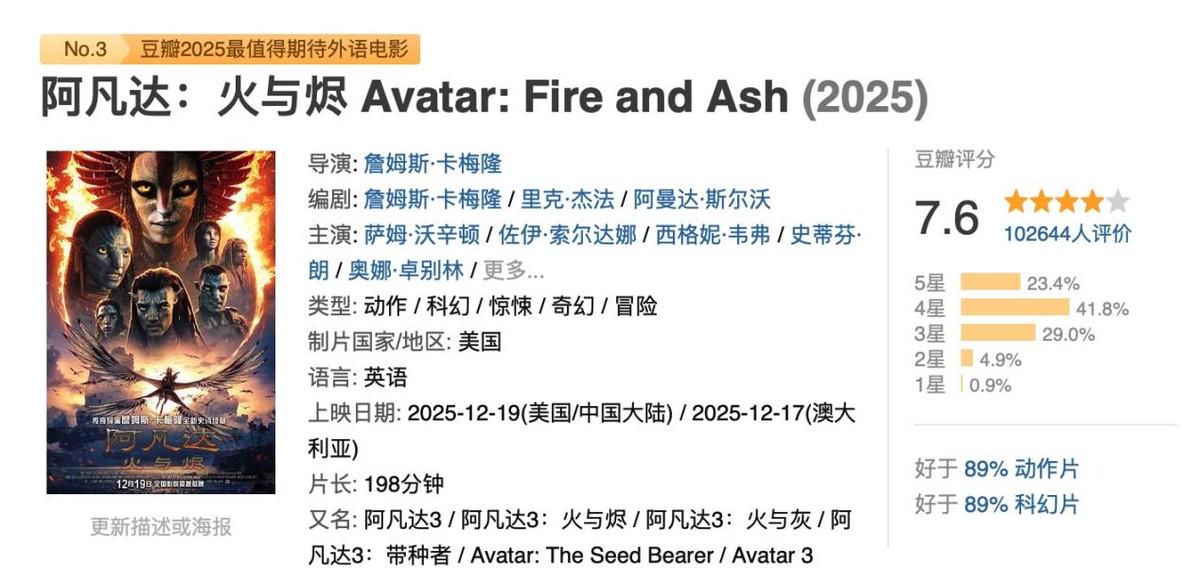 《阿凡达3:火与烬》上映首周末直接点燃全球影市,中国内地票房狂破4亿,全球票房轻松迈过1亿美元大关,豆瓣评分稳坐7.6分高位。