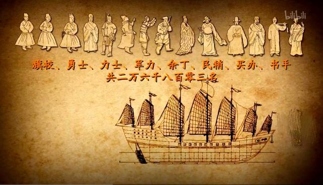 兵力与船数,常见的编制说法是把郑和舰队的“宝船”数量以及人员规模放在大约600艘、总人数27,000人的量级上头,这里面包含水手、民工,并且还有支用来登陆控制沿岸事务的陆战部队,据说也有万人左右。把船只分等级来估算总体吨位,这是一种便于理解的做法,按照一种设想把舰队分成三档:顶级宝船80艘,每艘按两万吨算;次一级宝船100艘,每艘5千吨计算;剩下的约4百艘按两千吨算。如此一来三类合计的吨位就是80×2万+100×五千+400×二千=二百九十万,这样子的数量级跟哥伦布乘坐的三艘船相比差距很大,足足相差四个数量级。