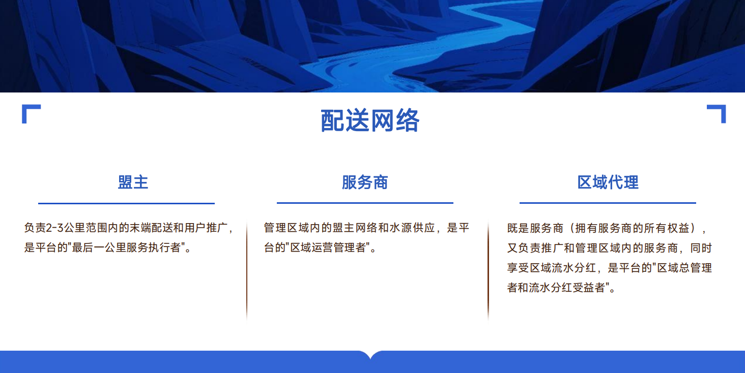 - 盟主:投入约2999元,负责配送与推广,每桶分别赚3元与2元。月送100桶可获约500元收益。