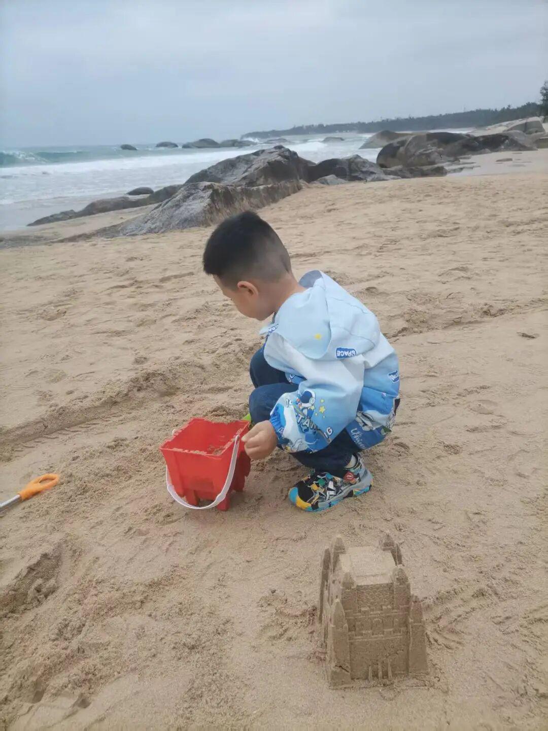 我们先后去了石头公园、铜鼓岭、宋氏祖宅,但是最喜欢的,还是淇水湾的沙滩——它不似亚龙湾那般喧闹,人少,清静。海水是透亮的蓝,沙滩宽阔绵软,沙子细得像筛过一样,嘟嘟在上面跑跑跳跳,捡贝壳、逐浪花,堆城堡,能玩上大半天。