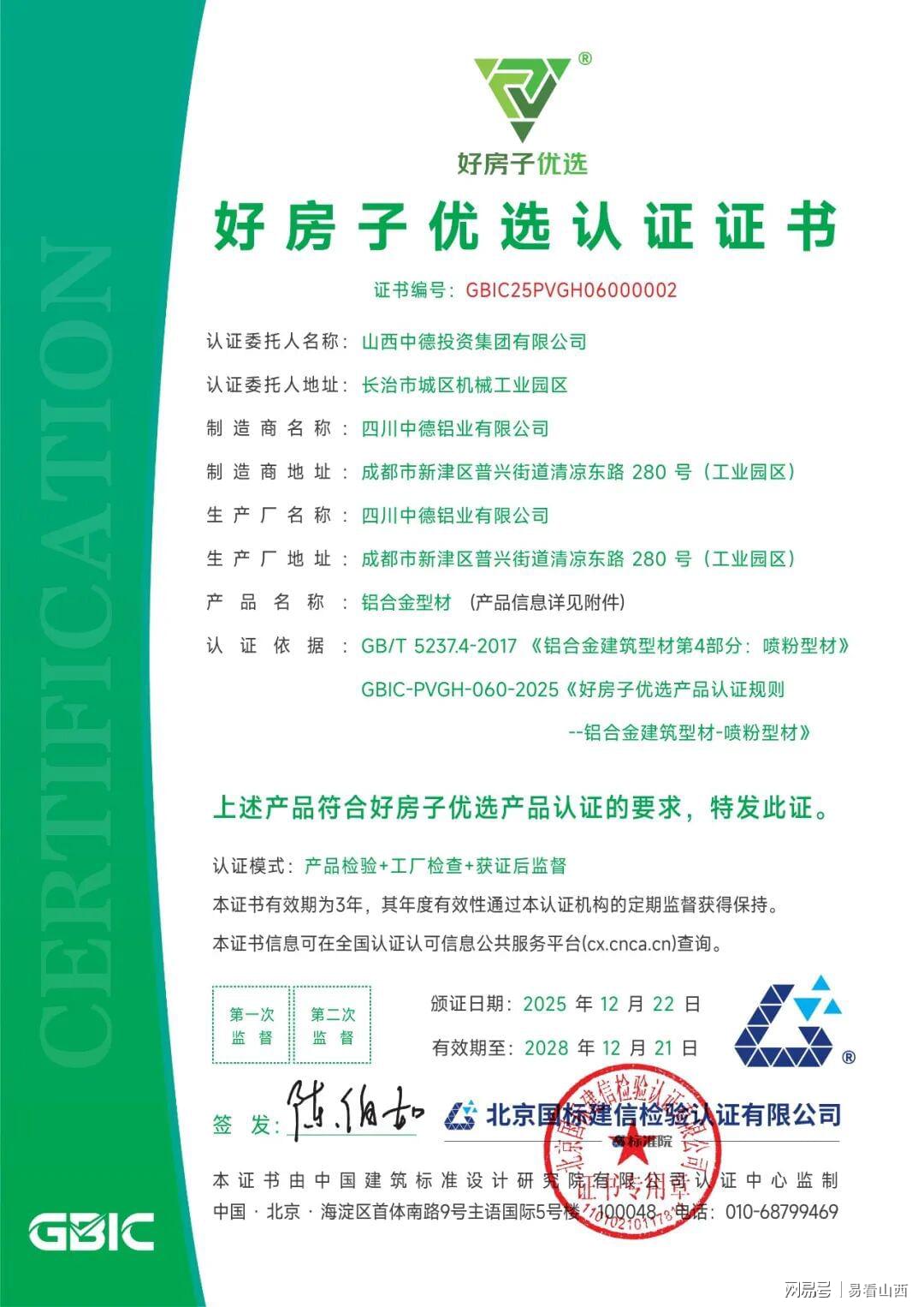 近日,中德型材、管材、铝材、系统门窗荣获北京国标建信检验认证有限公司颁发的“好房子优选”产品认证证书,成为行业首家获此殊荣的企业。