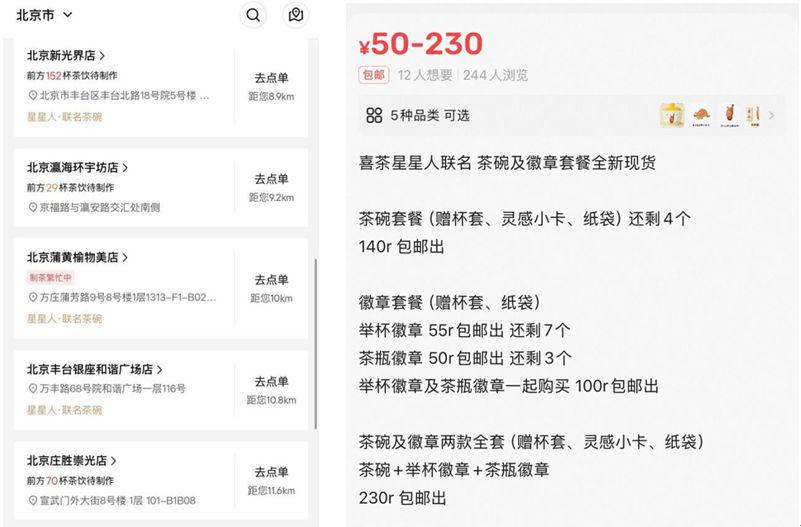 值得关注的是,热门周边迅速现身二手市场,原价78元套餐附赠的茶碗套装,转手被卖到140元;举杯徽章和茶瓶徽章的价格均在50元以上。