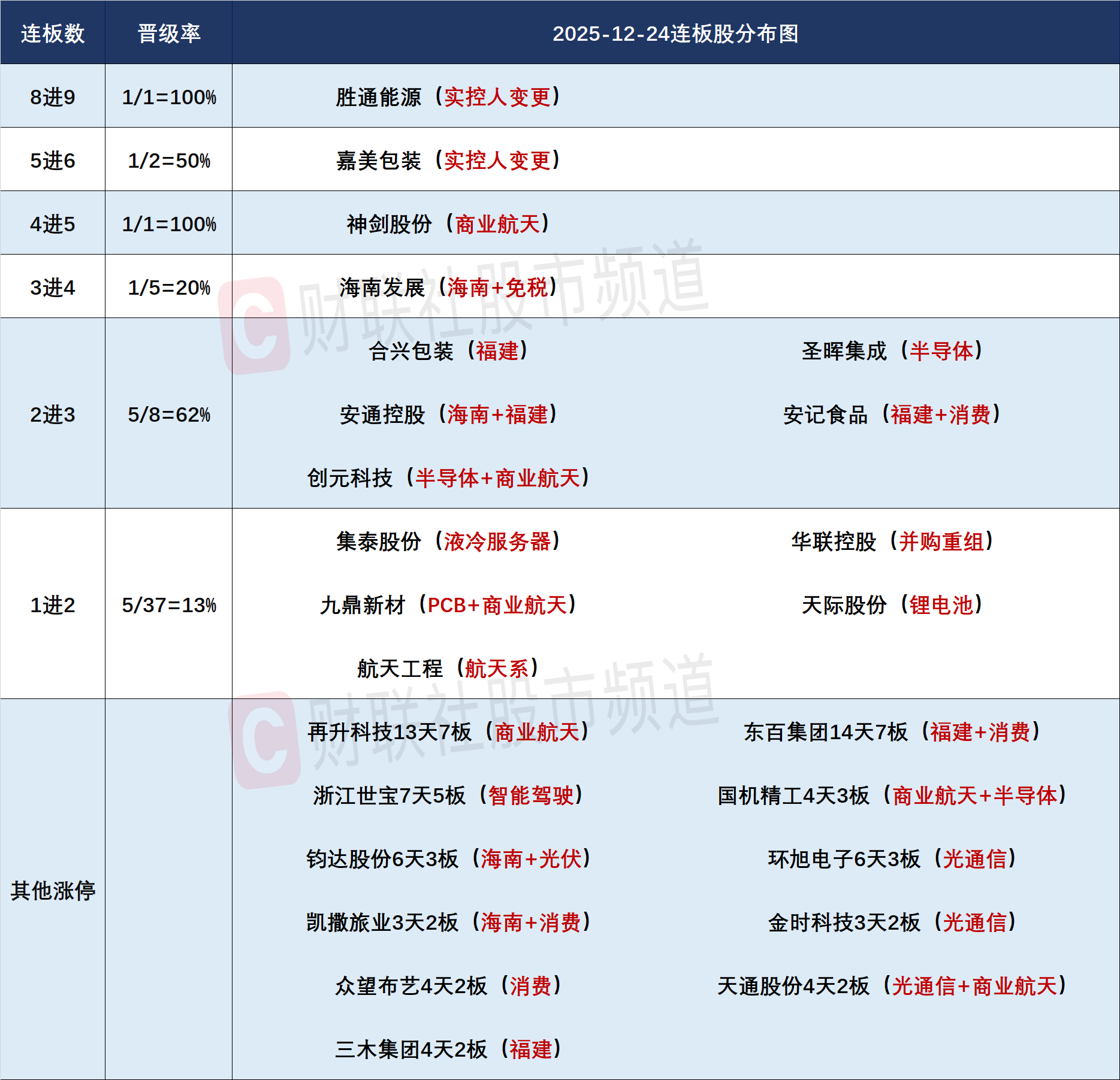 今日共75股涨停,连板股总数14只,其中三连板及以上个股9只,上一交易日共17只连板股,连板股晋级率52.94%(不含ST股、退市股)。个股方面,全市场超4100只个股上涨,短线情绪修复,胜通能源无惧停牌压力晋级9连板,神剑股份竞价反核录得5连板,高位人气股再升科技、浙江世宝走出反包涨停。值得注意的是,鹭燕医药尾盘炸板,导致连板高度(除连续一字涨停的胜通能源、嘉美包装)依旧维持在五板。板块方面,商业航天概念卷土重来,逾30股涨停或涨超10%,其中再升科技13天7板、神剑股份5连板、国机精工4天3板,新雷能、超捷股份、新劲刚、瑞华泰、有研粉材20CM涨停;算力硬件股午后强势拉升,环旭电子6天3板、金时科技3天2板,英唐智控20CM涨停,生益科技涨停创历史新高,消息面上,英伟达GB300系列服务器已于今年底开始小规模出货,预计明年上半年进入大规模放量阶段。