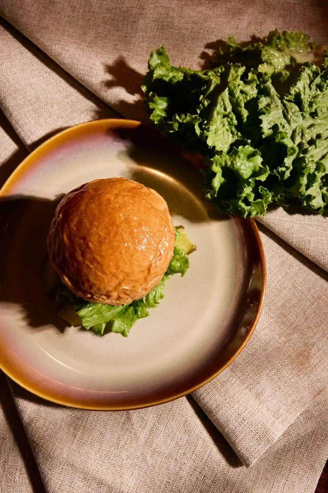 法式黄油面包夹两大块新鲜和牛肉饼,自制酱料,白车达芝士,烤 洋葱,黄油生菜和番茄。