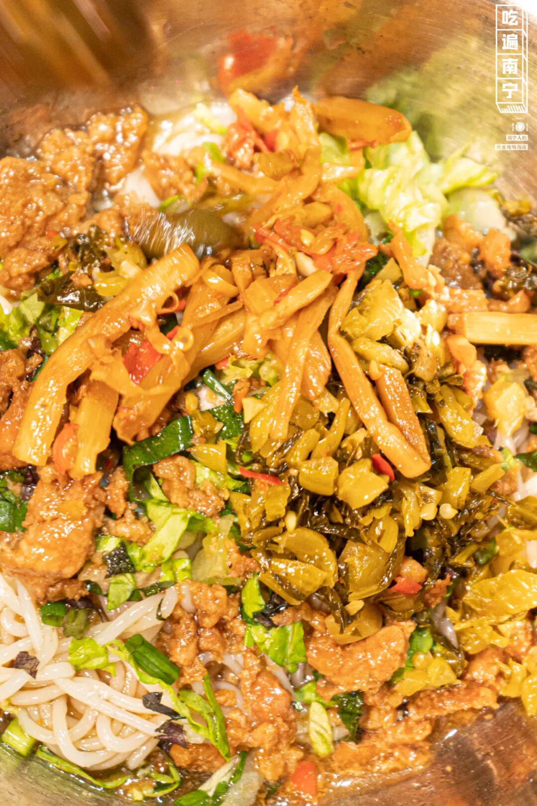 一勺厚实的肉沫铺满整个粉的表面,看着就很过瘾。赶紧打上一碗筒骨汤,汤水只要稍微没过粉的表面即可。速度搅拌,看着浓稠的酱料,瞬间令人食欲大开。