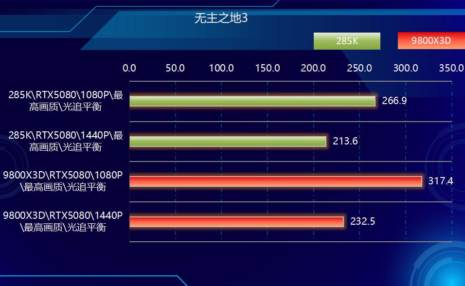 作为AMD和INTEL的高端CPU产品,9800X3D和285K都有着高级的硬件规格。除了能满足日常的使用之外,对于运行游戏也是非常给力。对于这两款高端CPU,为了不造成性能瓶颈,使用了RTX5080显卡来配合测试。虽然从全硬件规格上来说,这两款CPU不太相同。但是,9800X3D和285K都采用了8个大核心架构,在运行游戏时,能效小核心并不会参与工作,所以这一场PK,本质上是公平的。