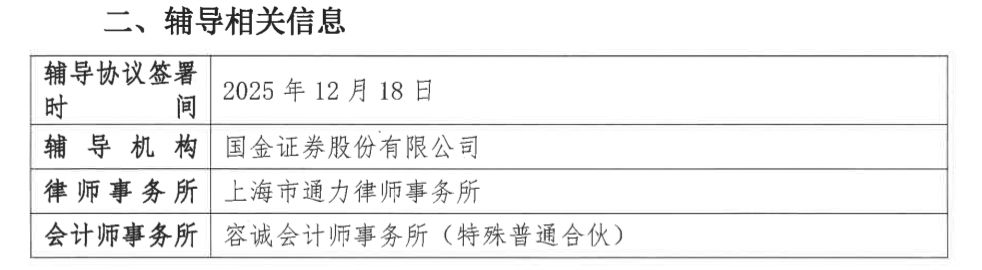 本次IPO的辅导机构为国金证券股份有限公司,律师事务所为上海市通力律师事务所,会计师事务所为容诚会计师事务所(特殊普通合伙)。