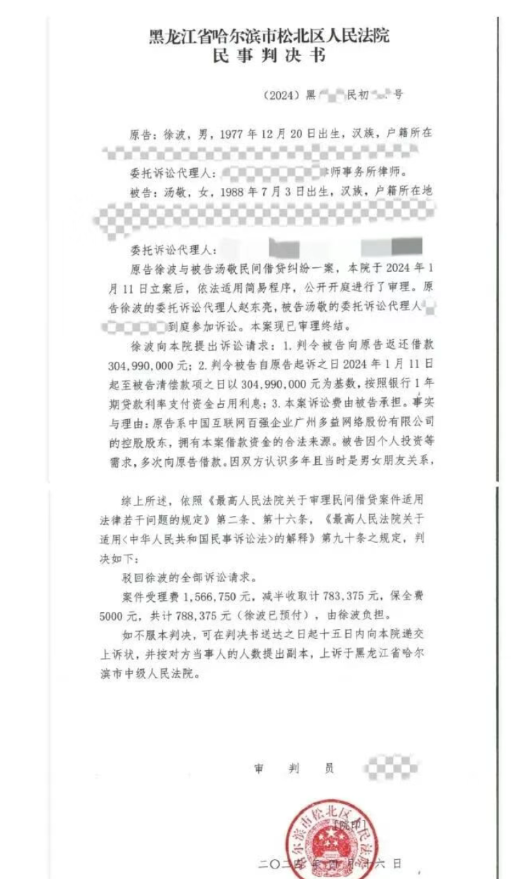 说那3亿转账是“共同抚养支出”,驳回了徐波的诉求。