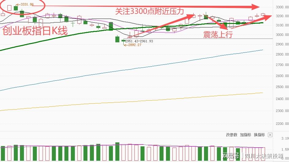 创业板指周三继续上涨,量能与昨日几乎持平,目前震荡上行趋势延续,关注前高3300点附近压力。