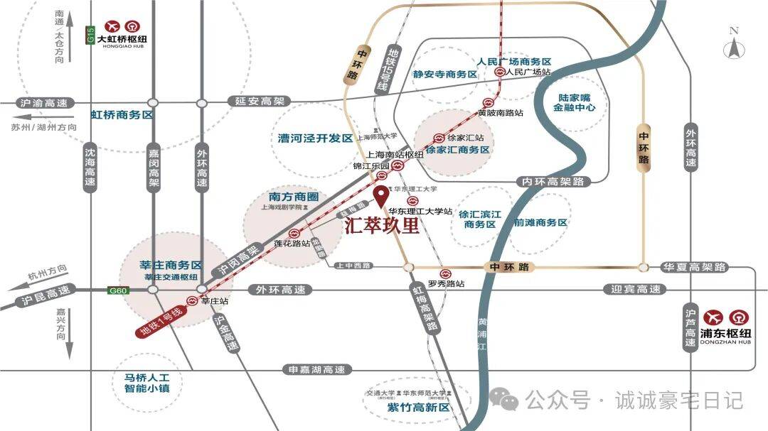 汇萃玖里坐落闵行与徐汇区主城的交界的黄金中环地带,中环上中西路下匝口,虹梅南路与益梅路交汇处、东至虹梅南路(中环高架)、南至北潮港、北至益梅路。