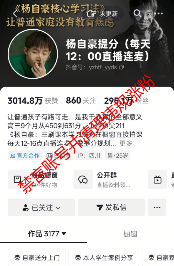 1.抖音账号“杨自豪提分”、快手账号“杨自豪提分”、小红书账号“杨自豪提分咨询”在教育领域“贩卖”焦虑带货卖课,造成恶劣影响。涉及的账号已依法依约处置。