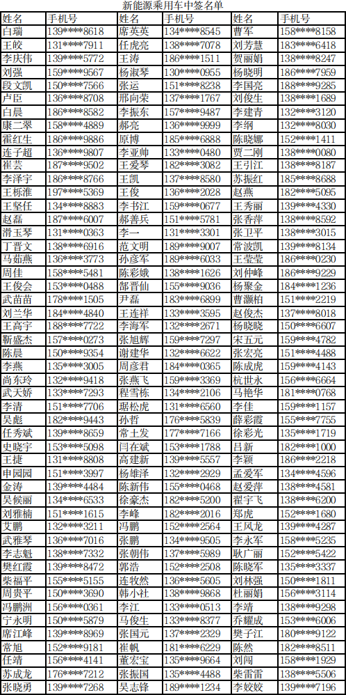 按照山西省商务厅关于调整2025年山西省汽车报废更新补贴活动规则的通告,山西省商务厅于2025年12月16日进行第三轮公证摇号,第三轮摇号共报名13908人,其中申请新能源车补贴人数7175人,申请燃油乘用车补贴人数6733人,本轮摇号名额递增第二轮摇号不符合条件名额32个,其中新能源车名额18个,燃油车名额14个,现将中签消费者名单公示如下。