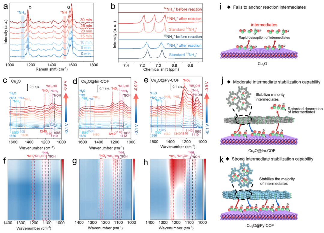 图5. 电化学eNO3RR过程的原位光谱分析。