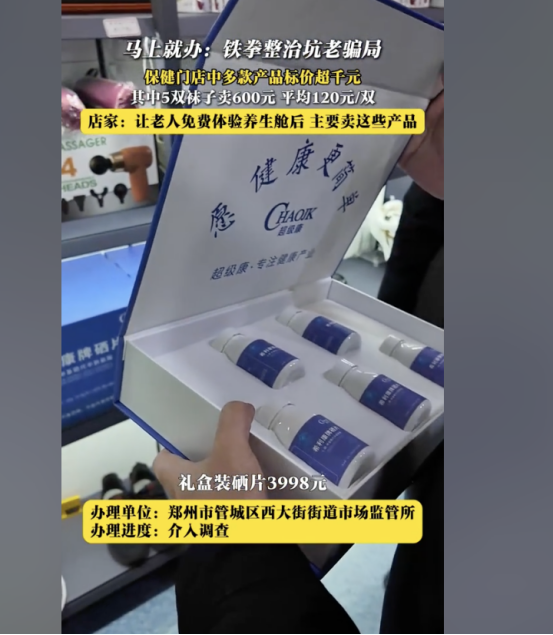 近日,郑州市管城区西大街街道市场监管所介入调查一起保健门店涉嫌虚假宣传、高价售卖产品的事件。在该门店中,多款产品标价超千元,5双袜子组成的礼盒装竟卖到600元,平均每双120元,此外还有高价硒片、生物共振能量项链、人参地龙蛋白蛹虫草等,这些产品究竟有何特殊之处能标出如此高价,引发了广泛关注。