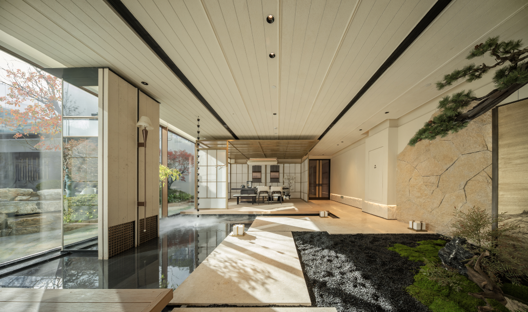 穿过大堂到右侧是茶室,茶台下流水与下沉庭院叠水遥相呼应,身处室内也恍若置身室外临水茶亭,满是自然野趣,令人不禁驻足,心甘情愿在此消磨惬意时光。