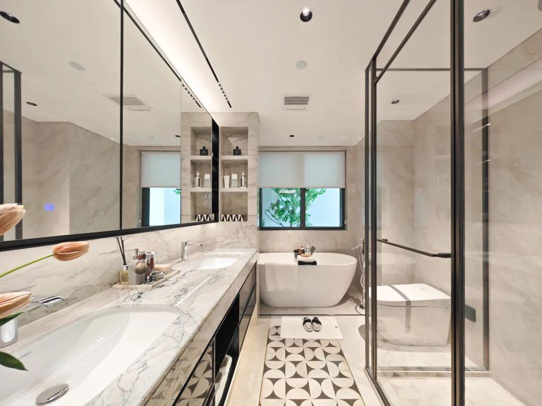 ③配置的诚意:主卫配置堪比五星级酒店,双台盆设计、独立浴缸、汉斯格雅淋浴系统、伊奈智能马桶……这些实实在在的“硬货”,将度假般的享受融入每一天的日常。