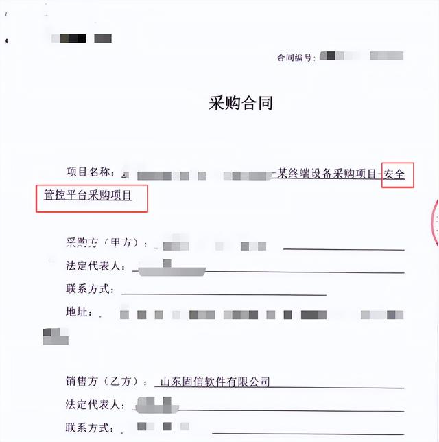 而为了证明“总公司”的实力,销售人员还发来多份固信的销售合同扫描件,其中一份合同的采购方显示为国内大型知名IT服务商,合同信息显示,该公司采购的软件为“安全管控平台”。