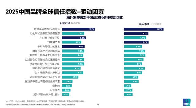 尽管「提供高品质的产品 / 服务」是全球消费者对中国品牌的共同核心诉求,但在发达市场与新兴市场中,各驱动因素的重要性占比仍存在显著差异。发达市场更注重关系型因素,“在沟通中诚实开放”和“非常有吸引力的雇主”跻身前三,反映出成熟市场消费者对品牌可持续发展能力的关注;新兴市场则更看重产品与环保维度,“以公平和道德的方式做生意”与“对环境负责”权重均达到8.1%,成为核心诉求点>