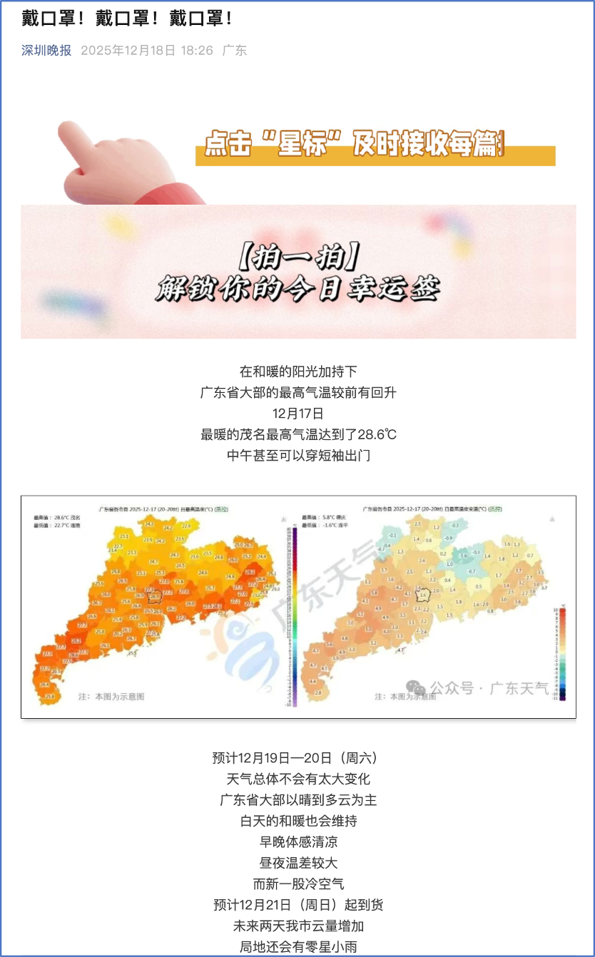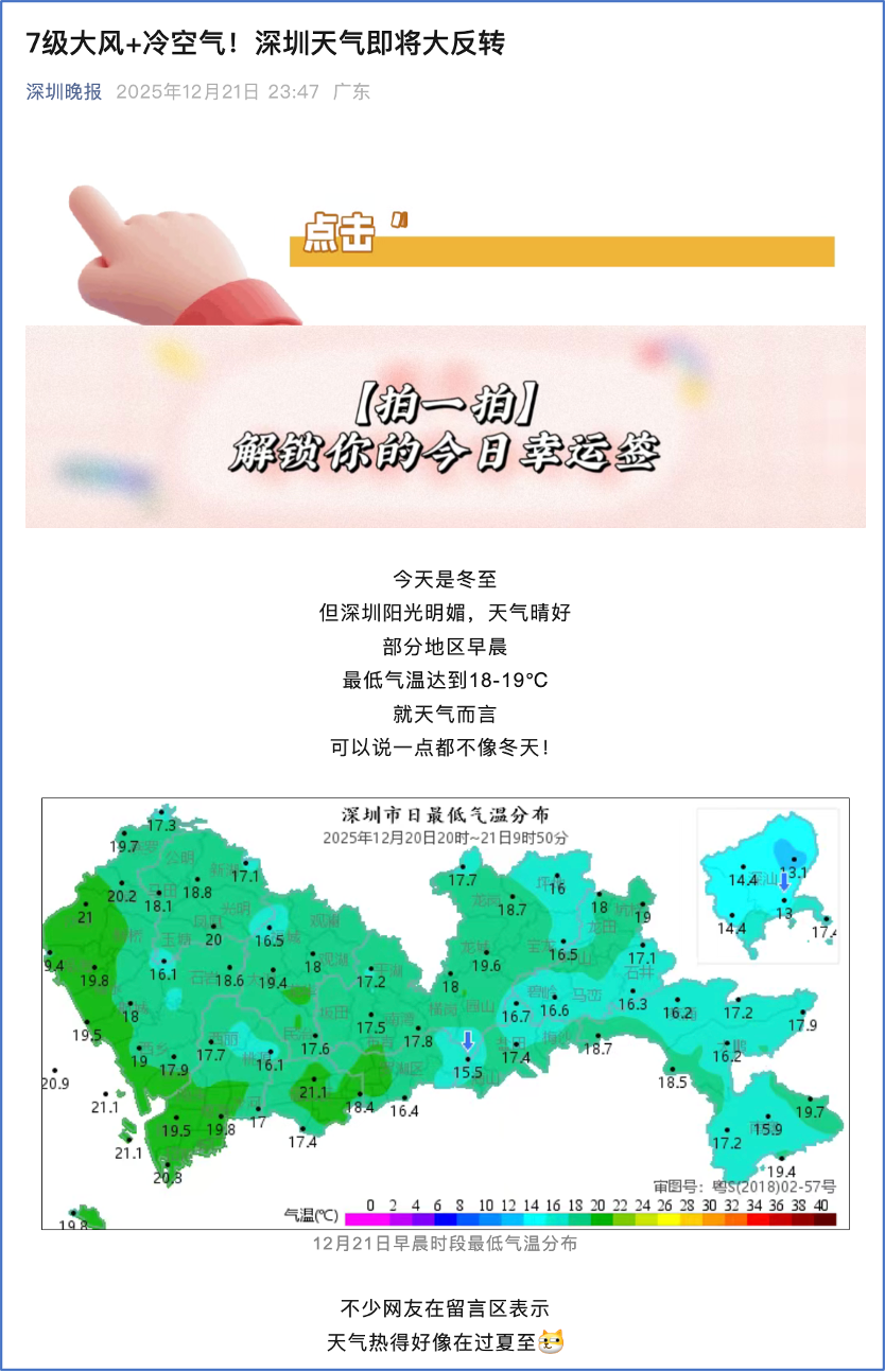 21日的23:47,该公号深夜再发文,标题是《7级大风+冷空气!深圳天气即将大反转》。但一如本地人都能感受到的,第二天风和日丽,气温最高达27°C。