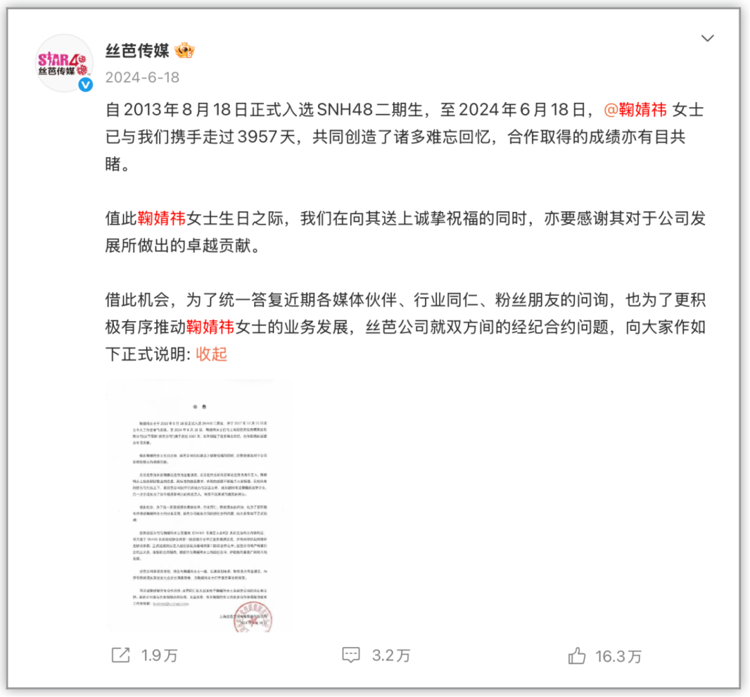 2024年6月18日,丝芭传媒一大早便在社交平台上祝鞠婧祎生日快乐,并发布公告称双方第一阶段合作圆满完成,根据补充协议条款,即日起进入第二阶段的合作。