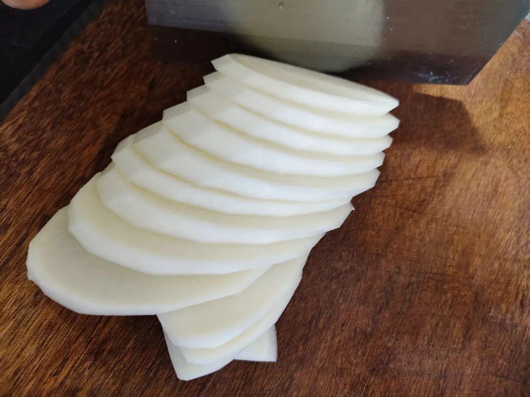 第三步,把白萝卜削去外皮,再切去萝卜顶和尾巴。然后顶刀切片,片的厚度比小手指略薄一些。这个不需要多好的刀工