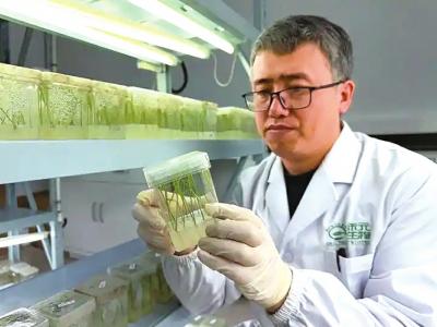 12月12日,禾元生物研发项目高级总监董亮亮在实验室观察稻苗状态。 图据新华每日电讯