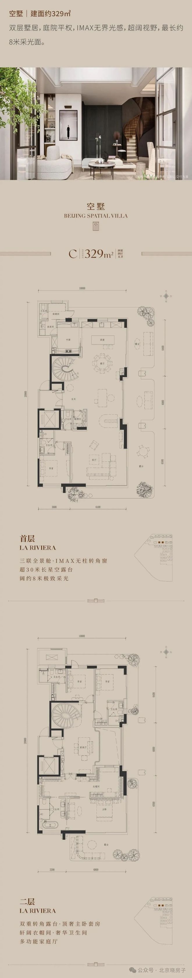 (2)跃层空墅:总高4层,上下两层复式空间,建面329㎡,同时带有空中露台和挑空,露台约120㎡,共40套,得房率高达137%。