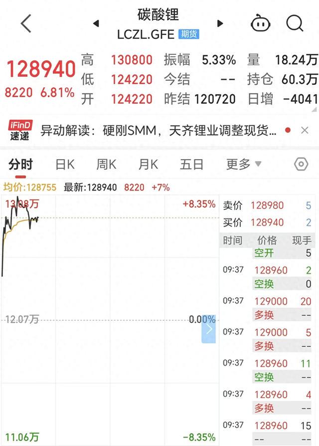 截至发稿时,碳酸锂主力合约报128940元/吨,涨幅6.81%。中新经纬注意到,碳酸锂期货主力合约此前已连续5个交易日飘红。