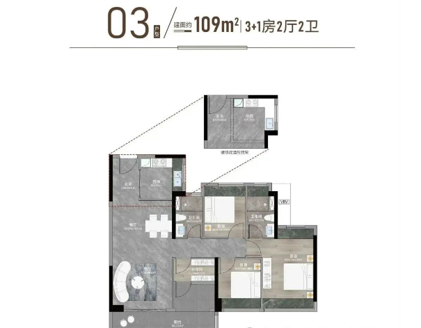 项目主力户型以“全南向、高实用、强功能”为核心亮点。90㎡三房采用横厅设计,四开间朝南,带独立玄关与连通阳台,实用率近100%,空间感远超同面积产品;109㎡四房配备6.2米南向超长阳台,可改造为多功能空间,实用率超100%;117㎡四房则进一步放大主卧套房与公共区域,满足三代同堂私密与互动双重需求。全系户型标配中央空调、双层中空玻璃,精装交付省心省力。在禅城区普遍单价超2万元的市场环境下,东建明德城以1.84万元/㎡左右的价格提供城芯地铁口、高实用率、品牌保障的改善产品,性价比突出,是预算有限但追求品质生活的家庭不可忽视的价值之选。