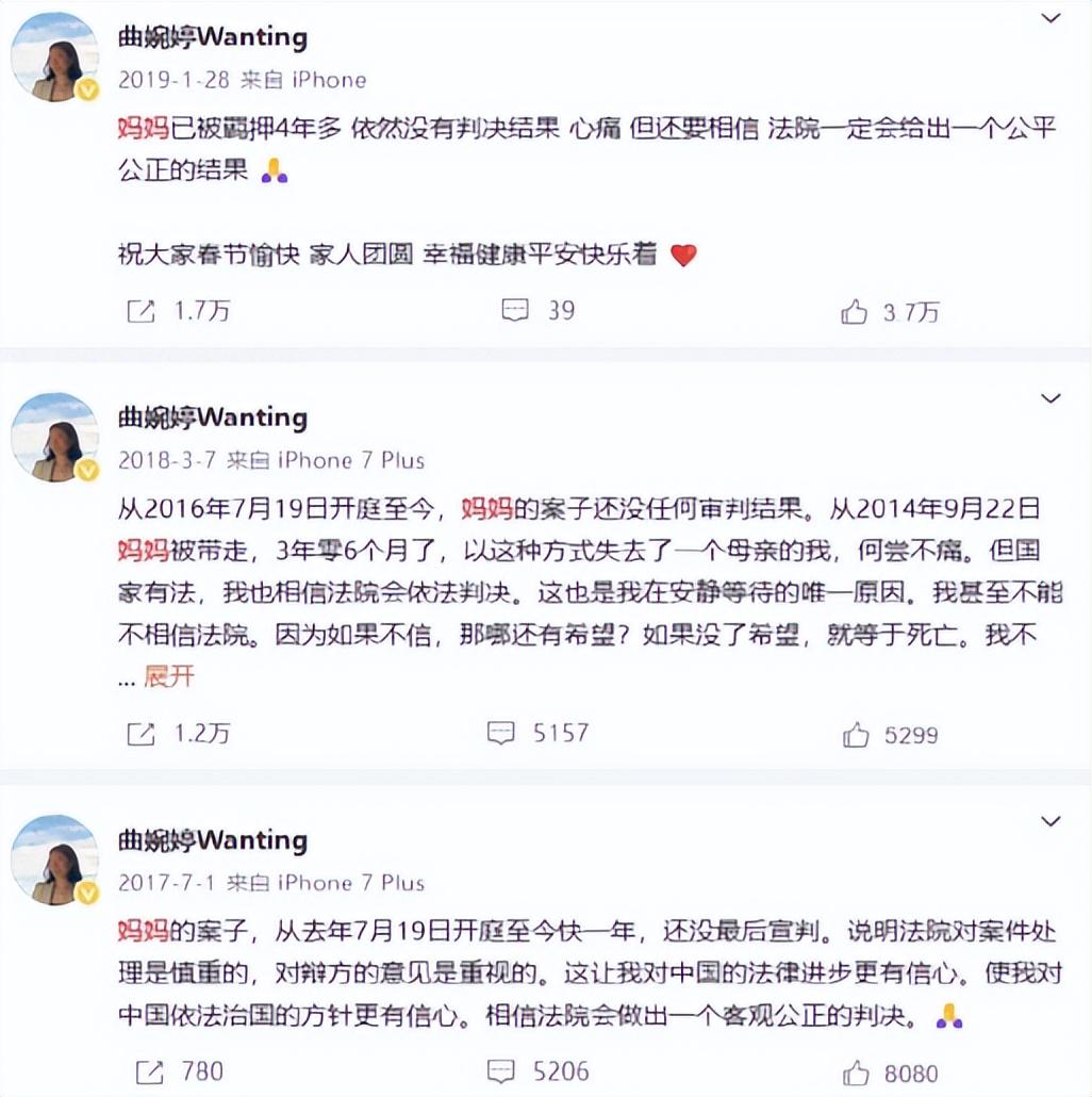 事实上,早前在风波爆发后,曲婉婷就在网上频频为其罪犯母亲喊冤。