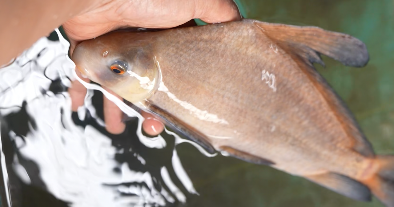 周亮:胭脂鱼它像川剧变脸一样的,小时候它是竖条纹,背帆你看很高也叫一帆风顺。然后它长到一两斤两三斤的时候,它这个竖条就会消失,就成了斑点状的纹路,鳍条也会慢慢变矮。但是再长大到了成熟的时候,这个斑点状就会消失,中间出现一条黑带,上背和下腹那个地方就是鲜红的颜色,我认为它是世界上大型的观赏鱼中最漂亮的。