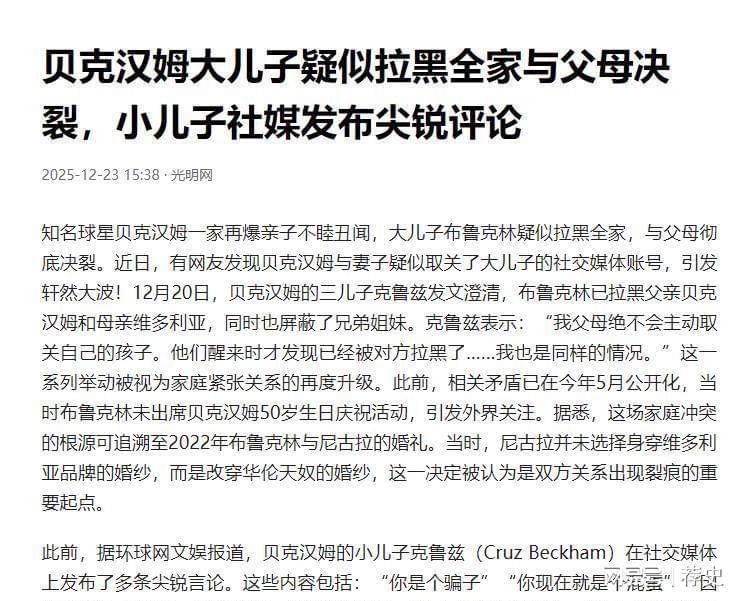 没过几个小时,布鲁克林就做出了极端的决定,把母亲维多利亚、父亲贝克汉姆,还有弟弟罗密欧、克鲁兹,连最小的妹妹哈珀都给拉黑了。