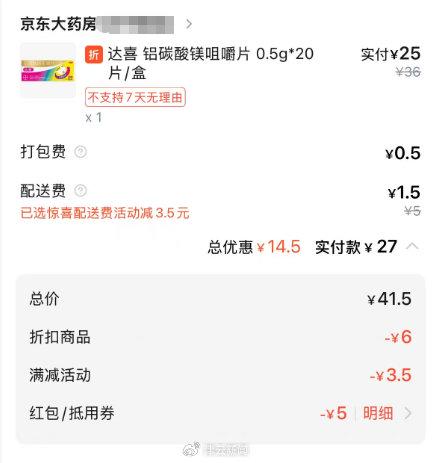 消费者张女士很清楚药品线上线下价格差距大的情况,所以日常购买药品时首选线上。她告诉津云记者,12月25日刚在淘宝闪购下了一单胃药“达喜”,平台显示药品原价36元,叠加包装盒配送费后共计41.5元,但平台优惠了14.5元,最终到手价格仅为27元。“比线下合适多了。”她直言,其实下单的时候人在外面吃饭,附近就有药店,但因明显的价格差她还是选择手机下单后送至办公室,“不用自己跑,还便宜这么多,没理由不选线上。”