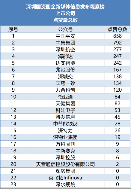 点赞量方面,中国平安、中集集团和深圳航空依然位列前三,分别获得858、792和277点赞。海能达、达实智能、兆驰股份点赞量均超过160。深房集团、英飞拓Infinova、深水规院点赞量则为0。