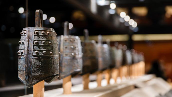 楚人好乐,楚国编钟多为双音钟,即在敲击钟之正鼓和侧鼓时能发出两个不同的音频。武王墩一号墓出土两套乐钟均为钮钟,尺寸依次递减,体型圆鼓,器身有36个螺旋形枚。桥形钮,钲间、篆带、鼓部均饰细密蟠虺纹,是战国中晚期至秦汉阶段最为流行的乐钟形制。本次展览展出的青铜编钟,展示了战国时期高超的声学造诣。