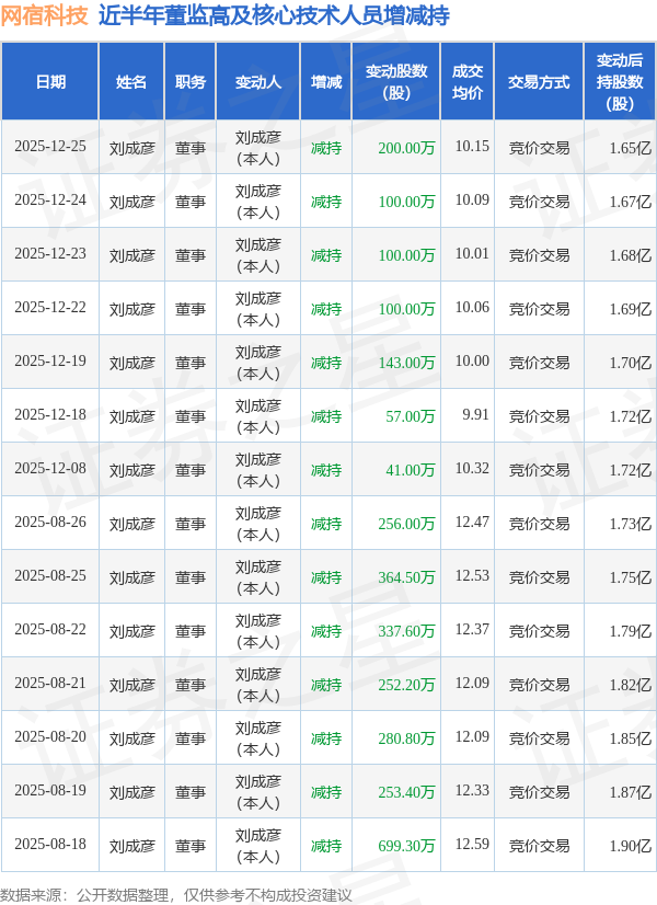 证券之星消息,根据12月26日市场公开信息、上市公司公告及交易所披露数据整理,网宿科技(300017)最新董监高及相关人员股份变动情况:2025年12月25日公司董事刘成彦共减持公司股份200.0万股,占公司总股本为0.0813%。变动期间公司股价上涨0.2%,12月25日当日收盘报10.17元。