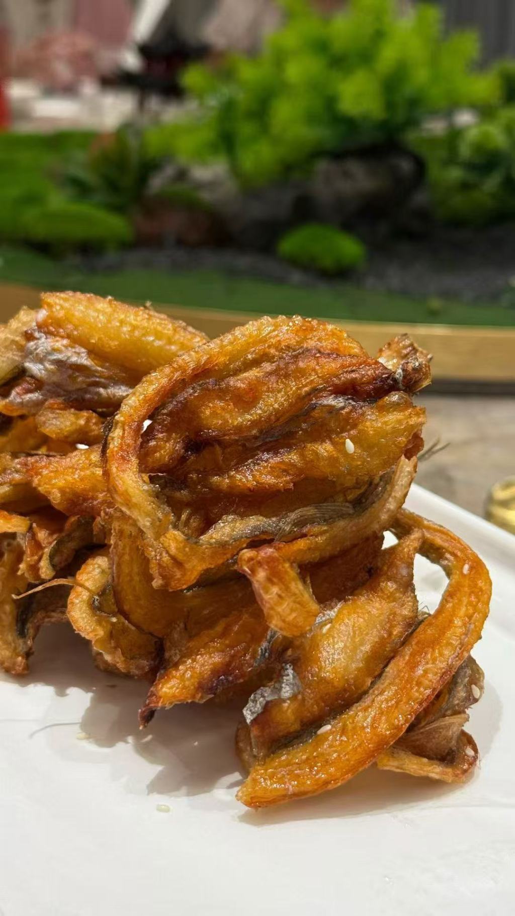 在龙宴餐厅,时令是被一盘盘端上桌的。椒盐水潺是此地很受欢迎的一道美食。水潺也称豆腐鱼,在广东一带则被称为“九肚鱼”,肉质细嫩柔软,虽然有刺,但胜在刺也柔软,只需要轻轻一抿,就能实现肉刺分离,再加上一些调味的椒盐,就是一道极好的下酒菜。