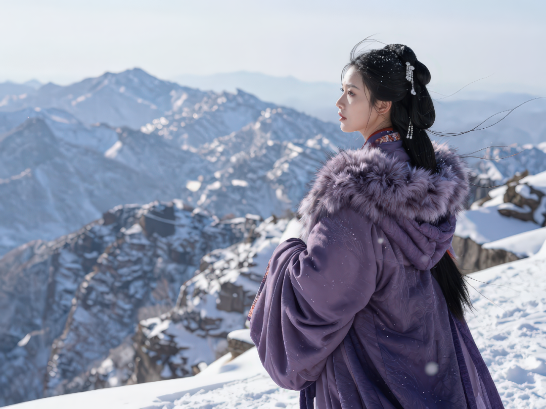 Standing on a snow-covered mountain overlook, wearing deep purple Hanfu with fur-trimmed collar and sleeves. Hair in a high bun with delicate tassels, eyes gazing into the distance. Wind lifts scarf and hair strands, snowflakes glimmer in sunlight. Panoramic view of snow-covered peaks, epic and serene winter ancient style. Composition: horizontal, ultra-high-definition.