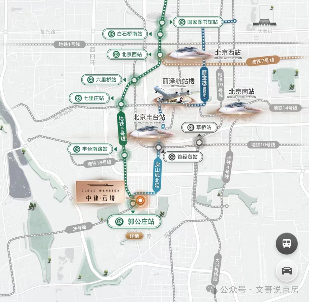 - 地铁:距9号线/房山线郭公庄站300米,规划丽金线(2026年通车)4站丽泽,8站金融街;房山线北延直达中关村。