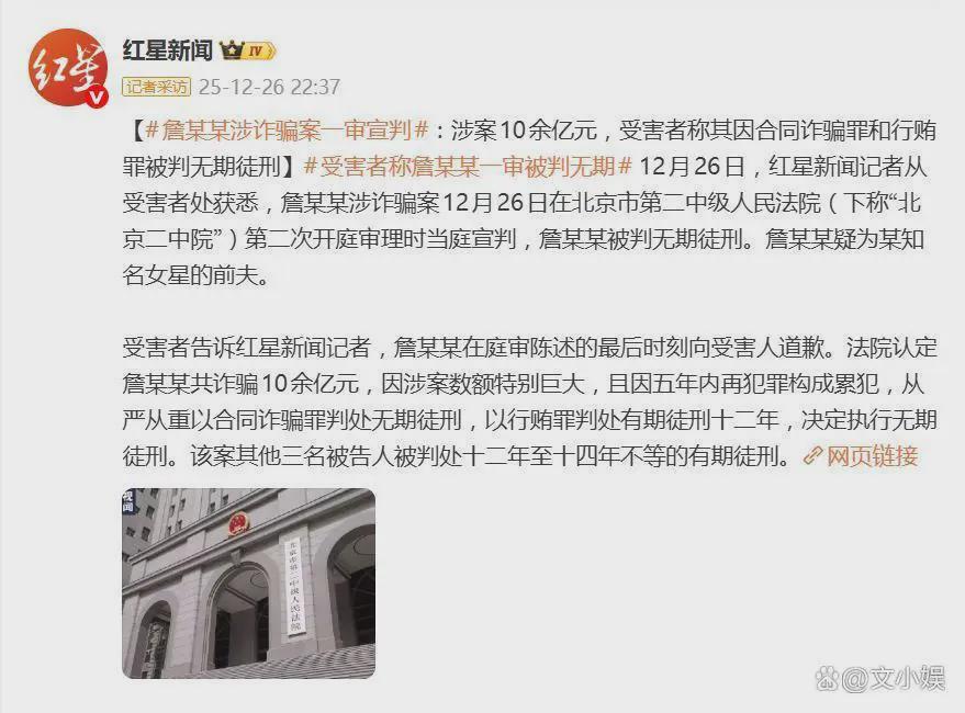 12月26日,北京市第二中级人民法院第二次开庭审理时当庭宣判:詹浩礼(即詹某某)因合同诈骗罪、行贿罪被判处无期徒刑,剥夺政治权利终身,其涉案金额被法院认定高达10余亿元(据此前报道,具体数额在12亿至13.9亿元之间)。