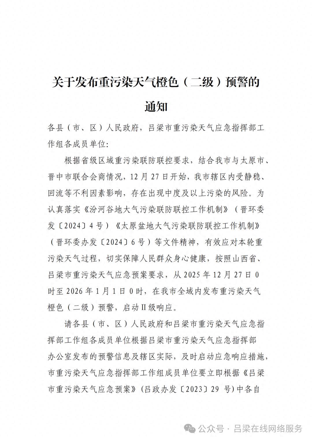 吕梁市发布重污染天气橙色(二级)预警 黄河新闻网吕梁频道 2025-12-27 14:09 ·山西 ·黄河新闻网吕梁频道官方网易号 吕梁市发布重污染天气橙色(二级)预警 打开网易新闻 查看精彩图片 打开网易新闻 查看精彩图片 来源:吕梁市生态环境